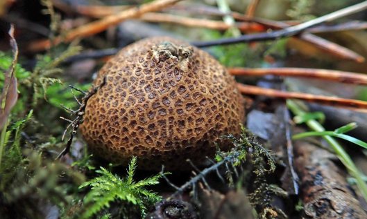 Though there are several species of earthball fungi in Britain, I’m fairly sure these are Common earthballs (Scleroderma citrinum), as they were found in the typical habitat of ‘acid soils with deciduous trees, usually Oak, Beech or birches’ (Collins Complete Guide to British Mushrooms & Toadstools, p.278).