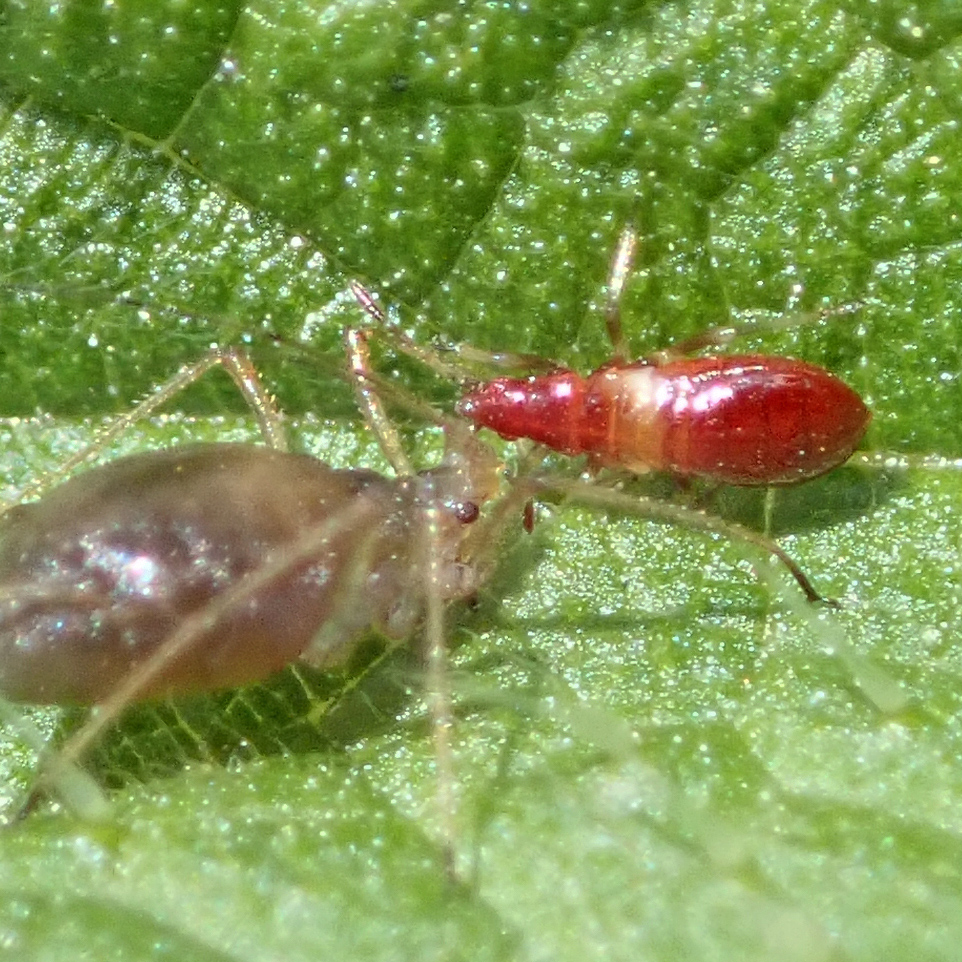 The two ladybird species (Arboreal ladybird and Kidney-spot ladybird) I’ve already blogged about weren’t the only new insects I happened to find at the end of last year. Common flower bug may be its common name but, apart from a tiny red nymph I spotted last summer (pictured here with an aphid, which will give you an idea of how tiny it really was), I’d never seen an adult Anthocoris nemorum until mid December.