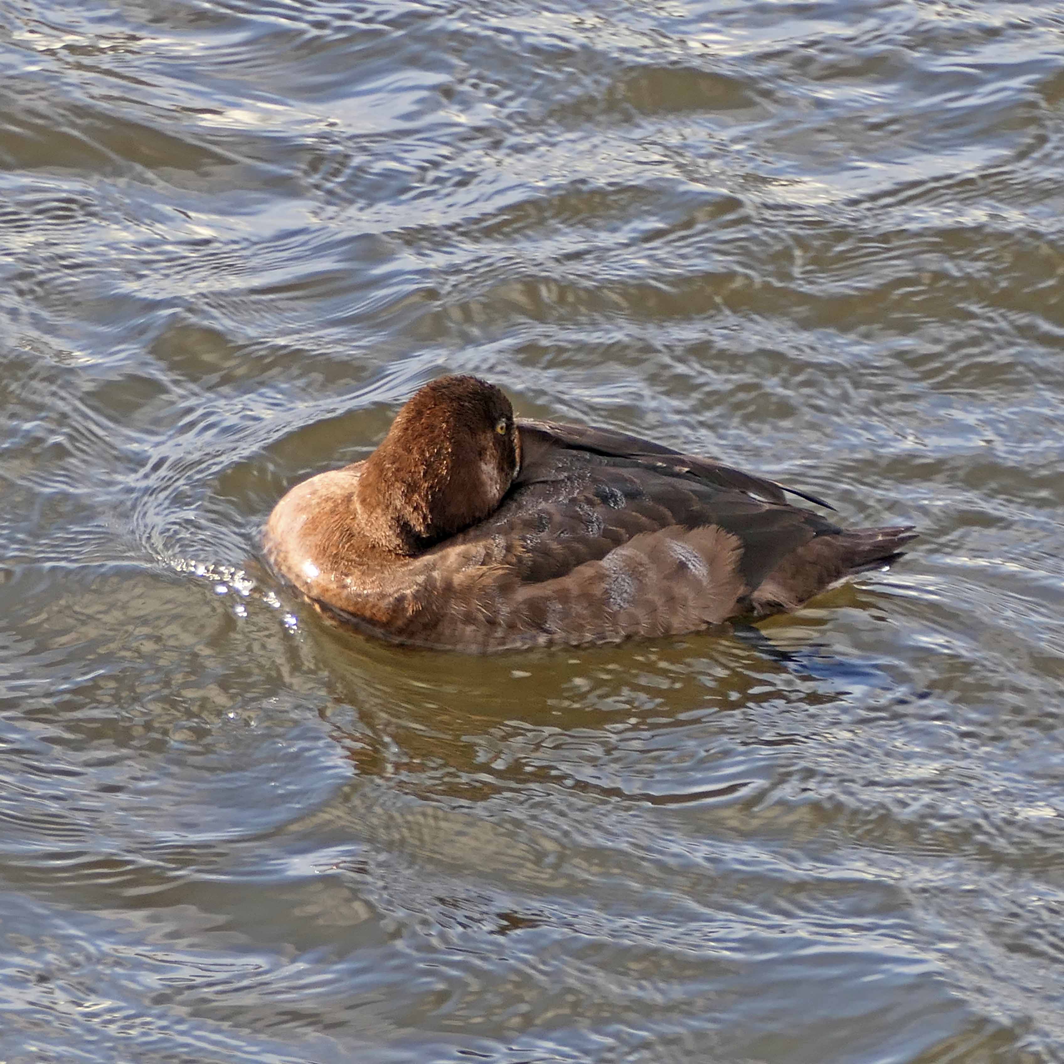 Luckily for me, this stunning female Scaup was still there, and, for the next 15 minutes or so, I enjoyed wonderfully close views. Most of the time she had her head tucked under her wing snoozing but twice, when a group of noisy people walked along the pavement behind me and when one of the water buses left Mermaid Quay to sail up the River Taff to central Cardiff, the Scaup lifted her head to scan her surroundings. Unfortunately, the revving engines, passenger screams, and wave action caused by a Cardiff Jetboat hurtling around nearby then caused almost the entire flock of birds to panic and fly to the other side of the Bay, exactly what I had feared might happen. (And don’t even get me started on the damage and disturbance that jetboat causes in the Bay!)