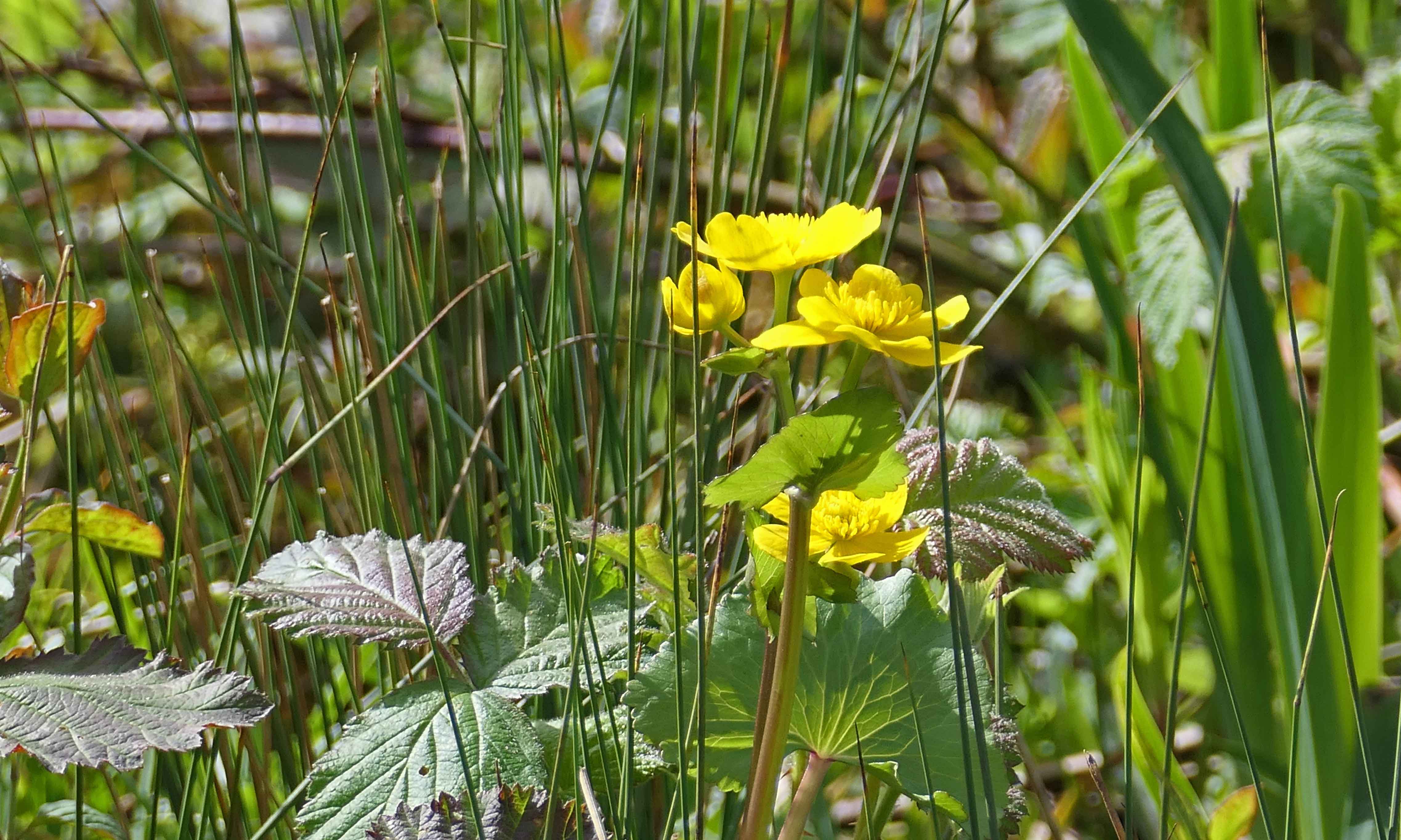 Marsh marigold: a small survivor from a more numerous population, where a volunteer group decided they would build a dead hedge. Make it make sense!