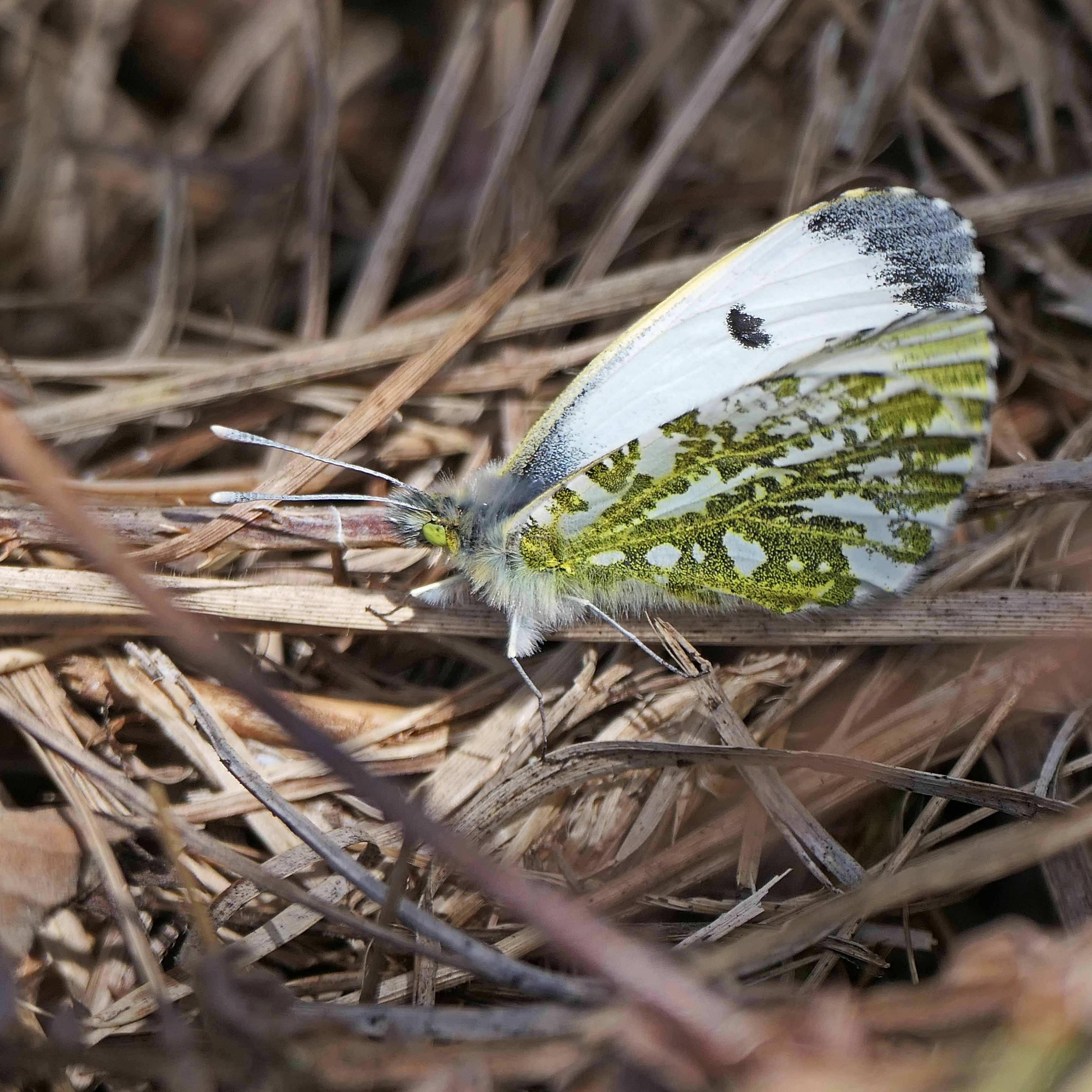 Male Orange-tips (Anthocharis cardamines) emerge first (and, indeed, that’s true for most butterfly species) and, in their search for females to mate with, they fly almost continuously up, down and around a defined territory, a frustrating activity, both for the butterflies as they wait for females to hatch and for the photographer trying to get shots of them. In fact, it’s exhausting just watching the constant activity of these little creatures and, though they do pause briefly to refuel and rest, you have to be in the right place at the right time to catch them. So far this year, my patient watching has not been rewarded; I’ve only managed to get blurry images of males as they zoom past.