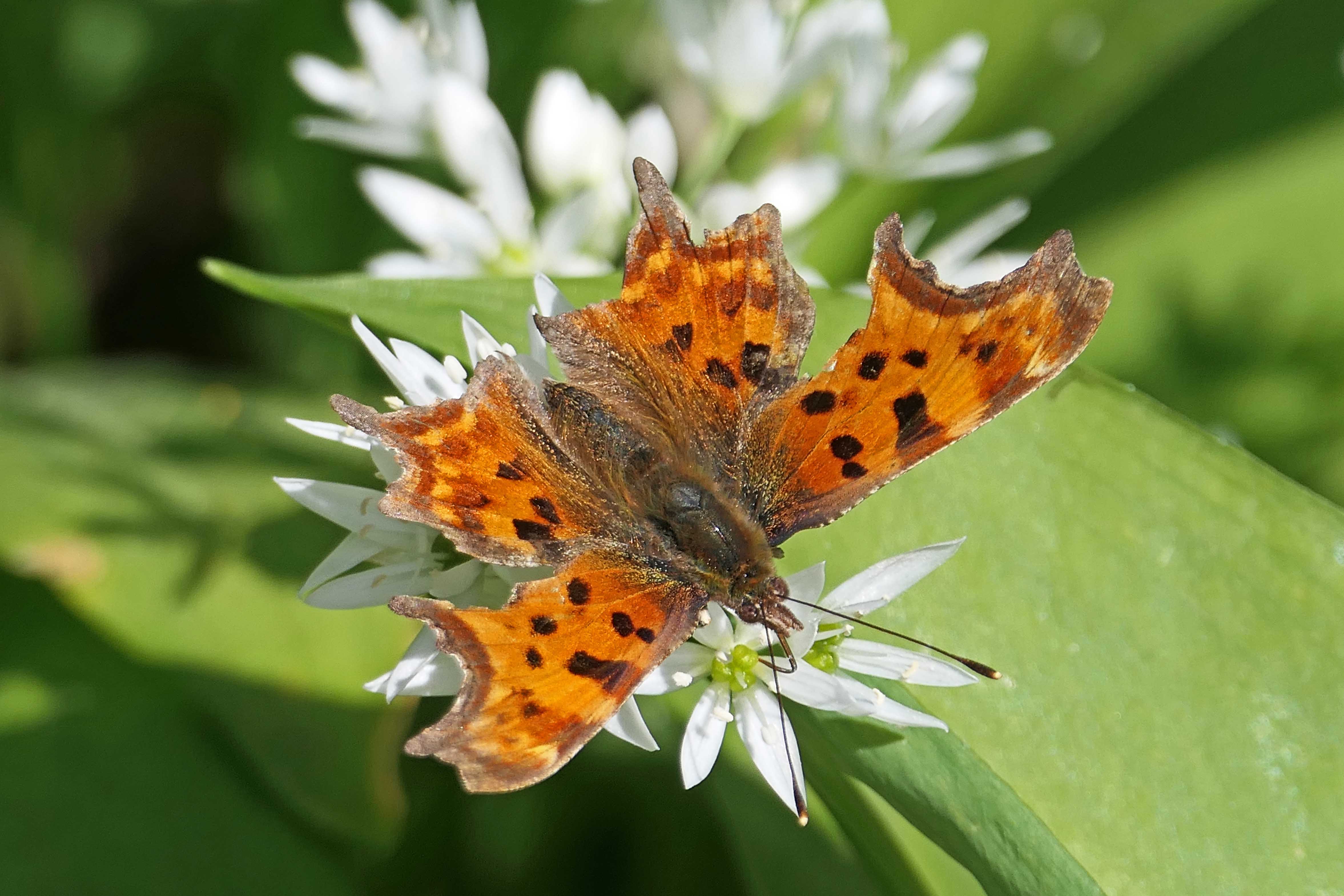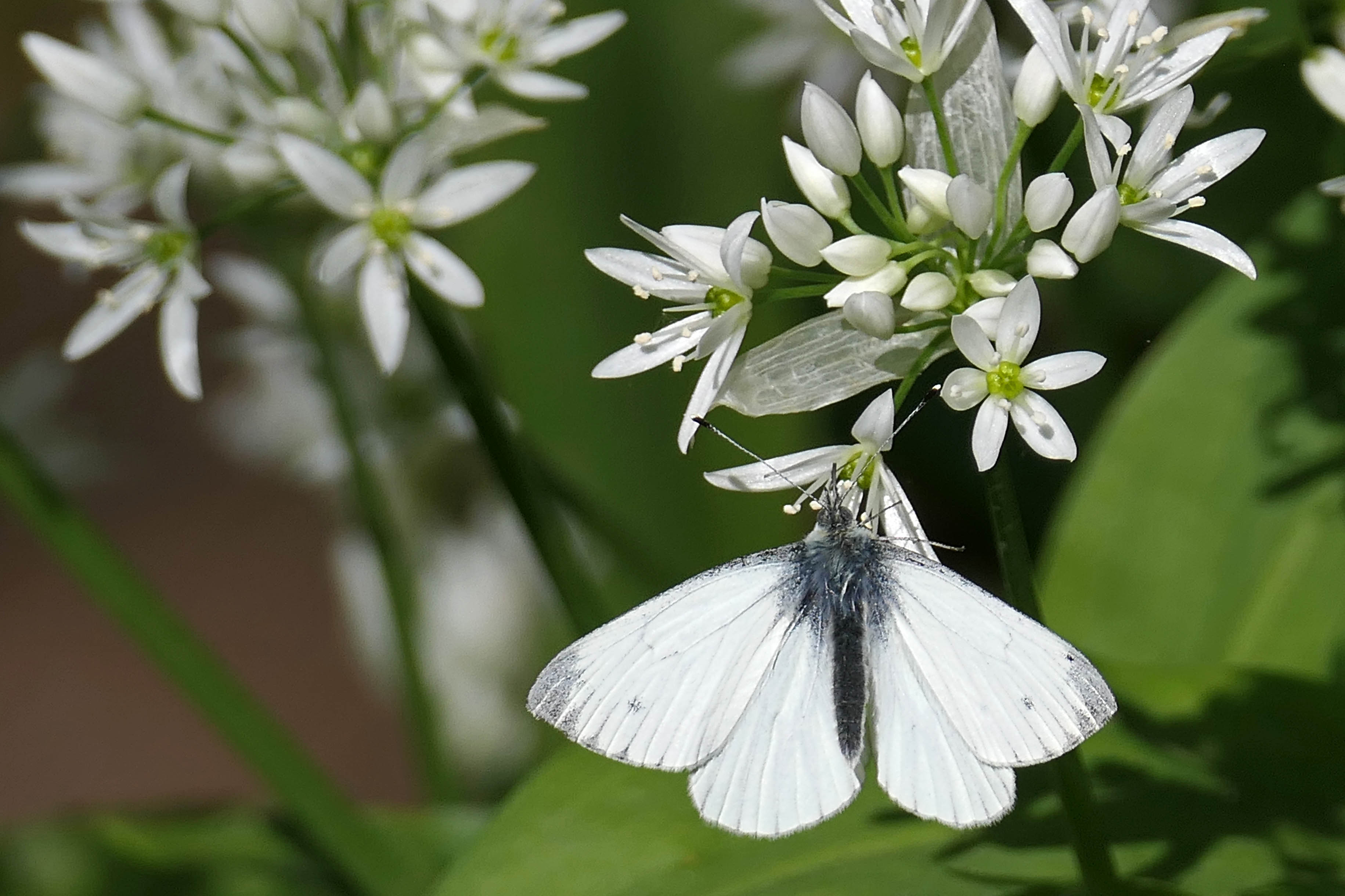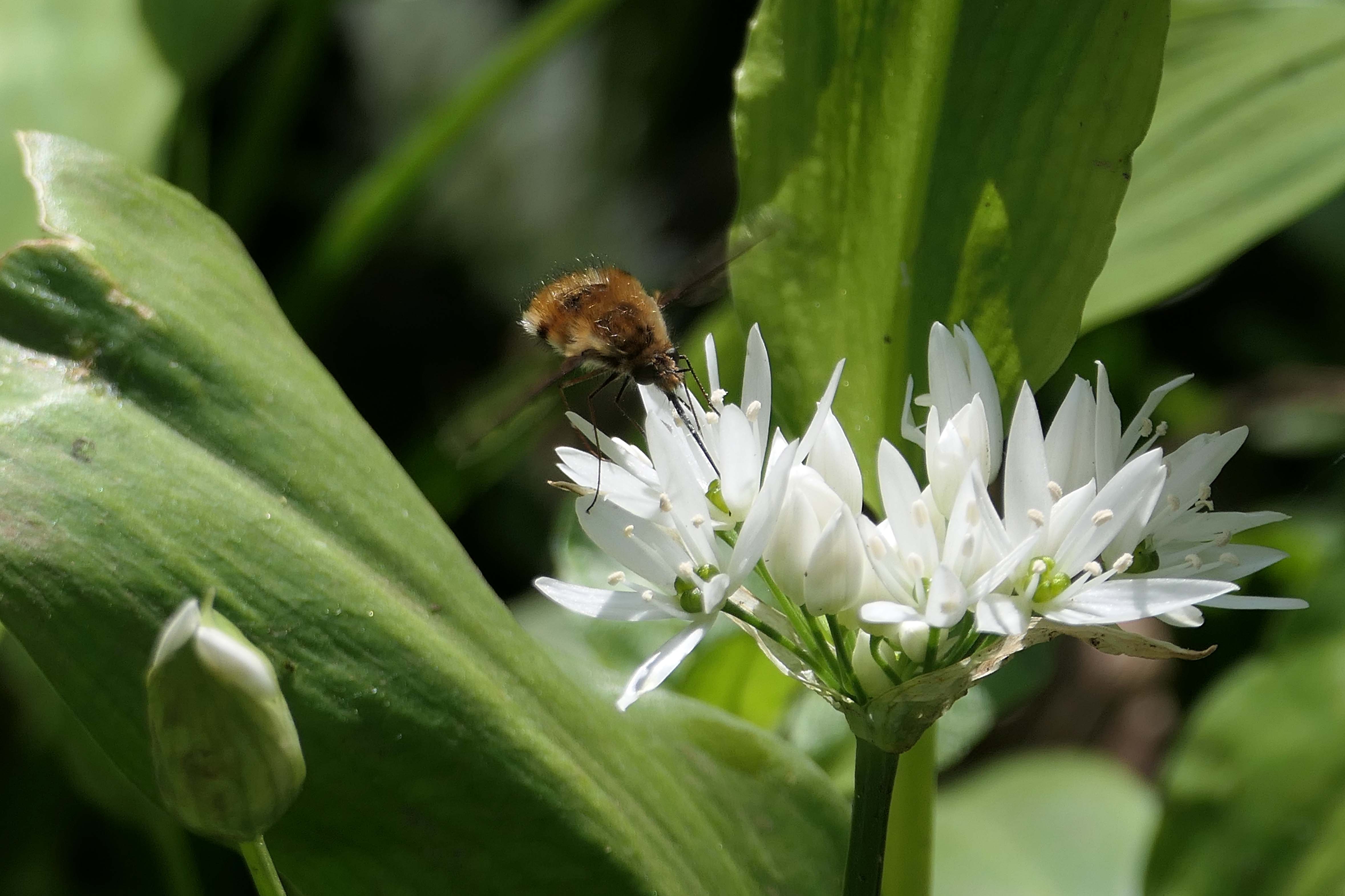 Allium ursinum, British wildflowers, Comma, Cwm George woodland, Dark-edged bee-fly, Green-veined white, insects on Wild garlic, Ramsons, Wild garlic