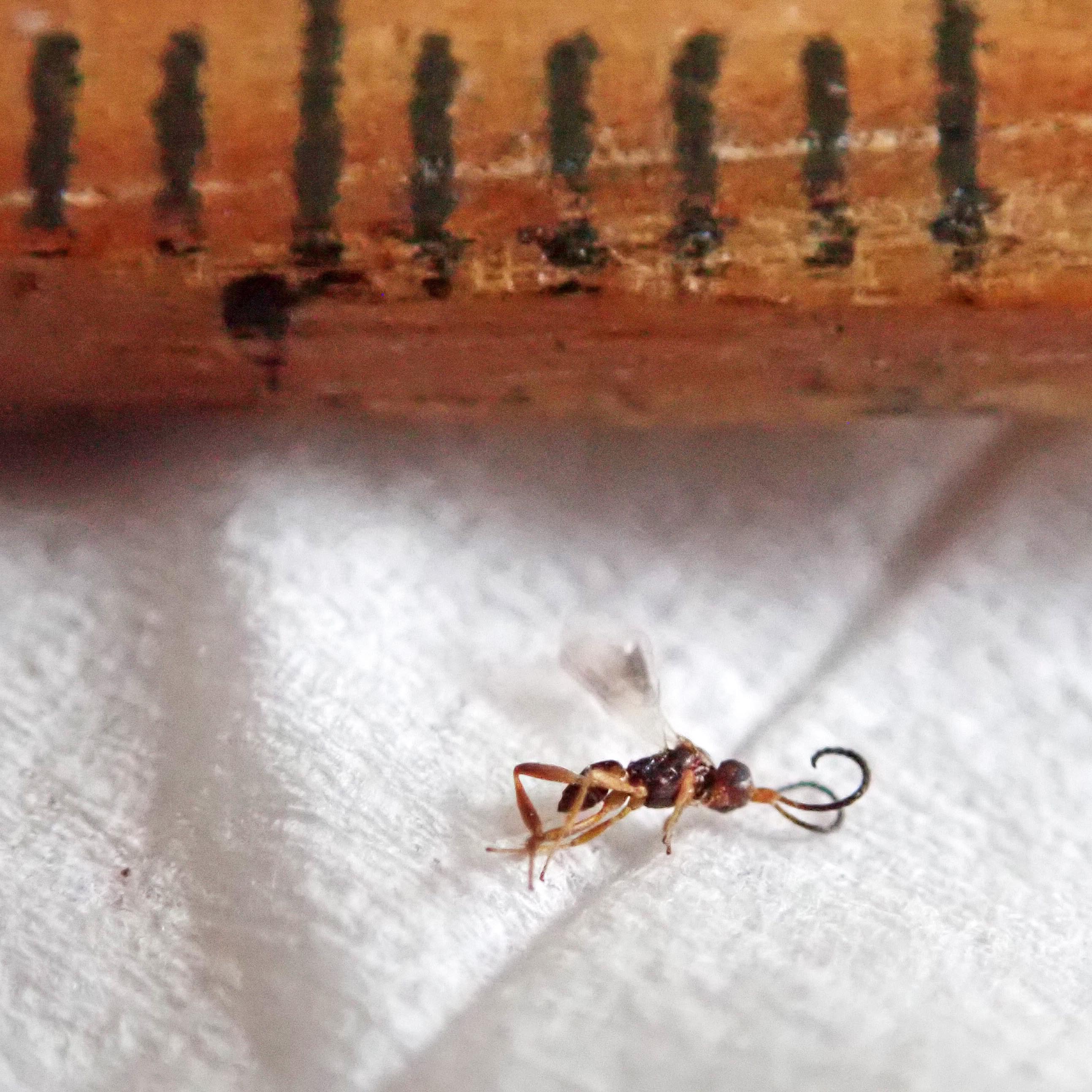 That tiny wasp has now hatched. As is often the case with these miniscule creatures, I have no way of determining which exact species of parasitic wasp it is, and I do realise that the whole concept of a wasp larva eating a moth larva from the inside while it’s still alive is a bit gory (perhaps I should’ve posted this on Halloween!), but I find it fascinating, both the process of parasitism and also bringing the occasional things home to see what emerges. The little wasp, a male, has been released to live its best life.